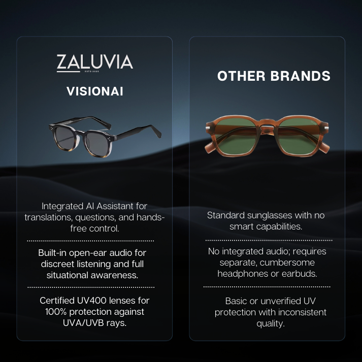 VisionAI is only available at Zaluvia. Don't get misled by lookalikes with poor audio, clumsy controls, or uninspired designs. When it comes to your daily tech, seamless integration matters—and VisionAi delivers every time.
